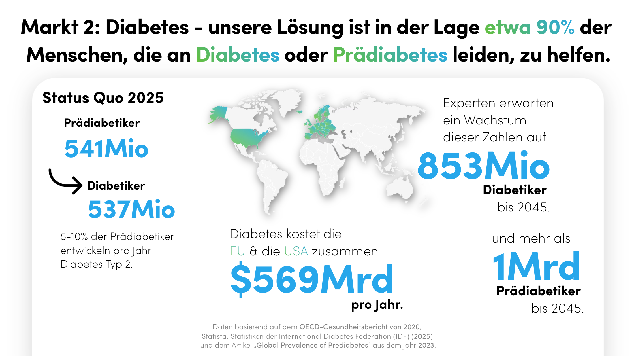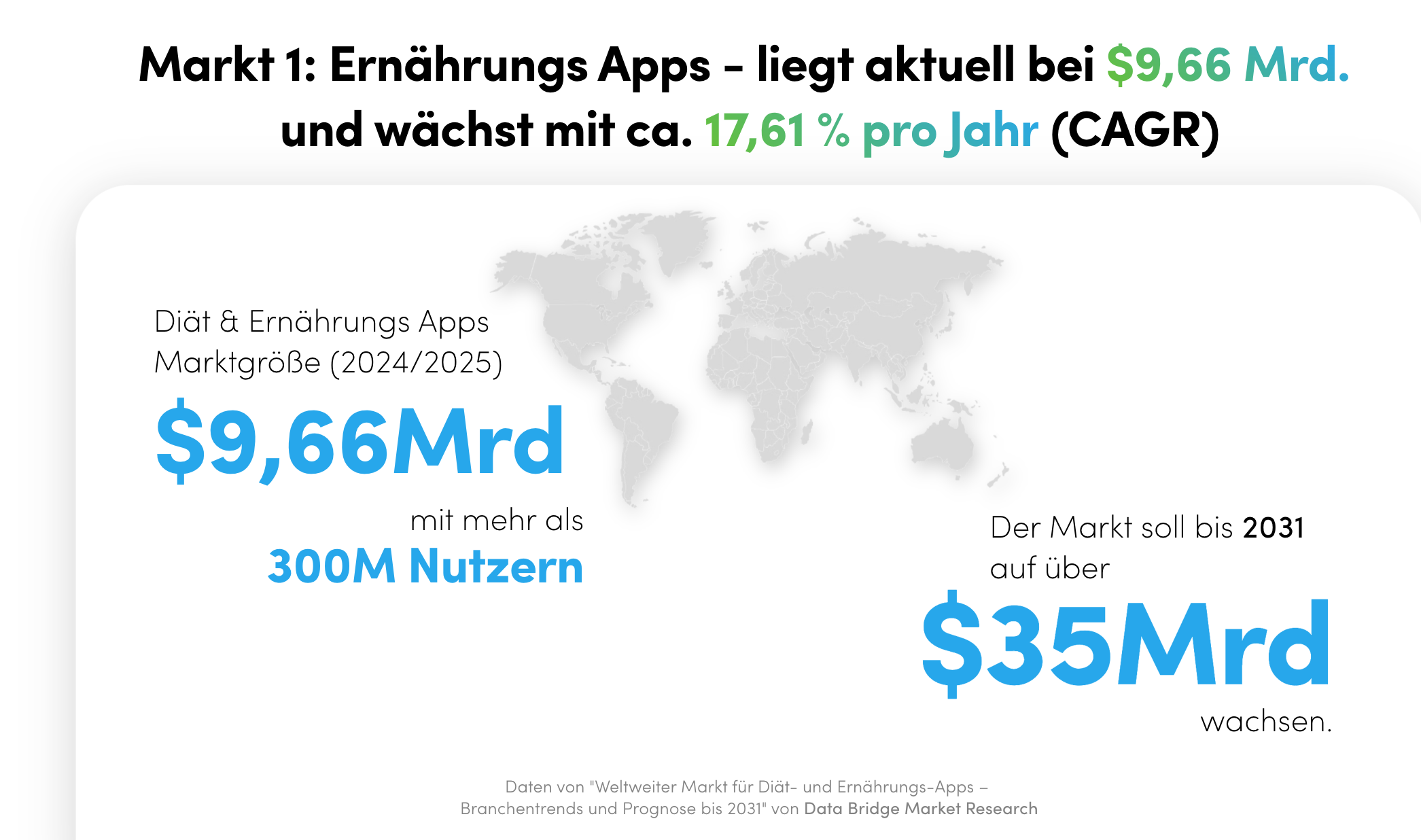 Wir adressieren den globalen Markt für personalisierte Ernährung. Weltweit leiden rund 1 Milliarde Menschen an Erkrankungen wie Diabetes, Herz-Kreislauf-Erkrankungen und Krebs und über 2 Milliarden an Übergewicht. Zudem nutzen bereits etwa 300 Millionen Menschen Ernährungs-Apps – ein schnell wachsendes Segment mit einer jährlichen Wachstumsrate von 17,6 %.