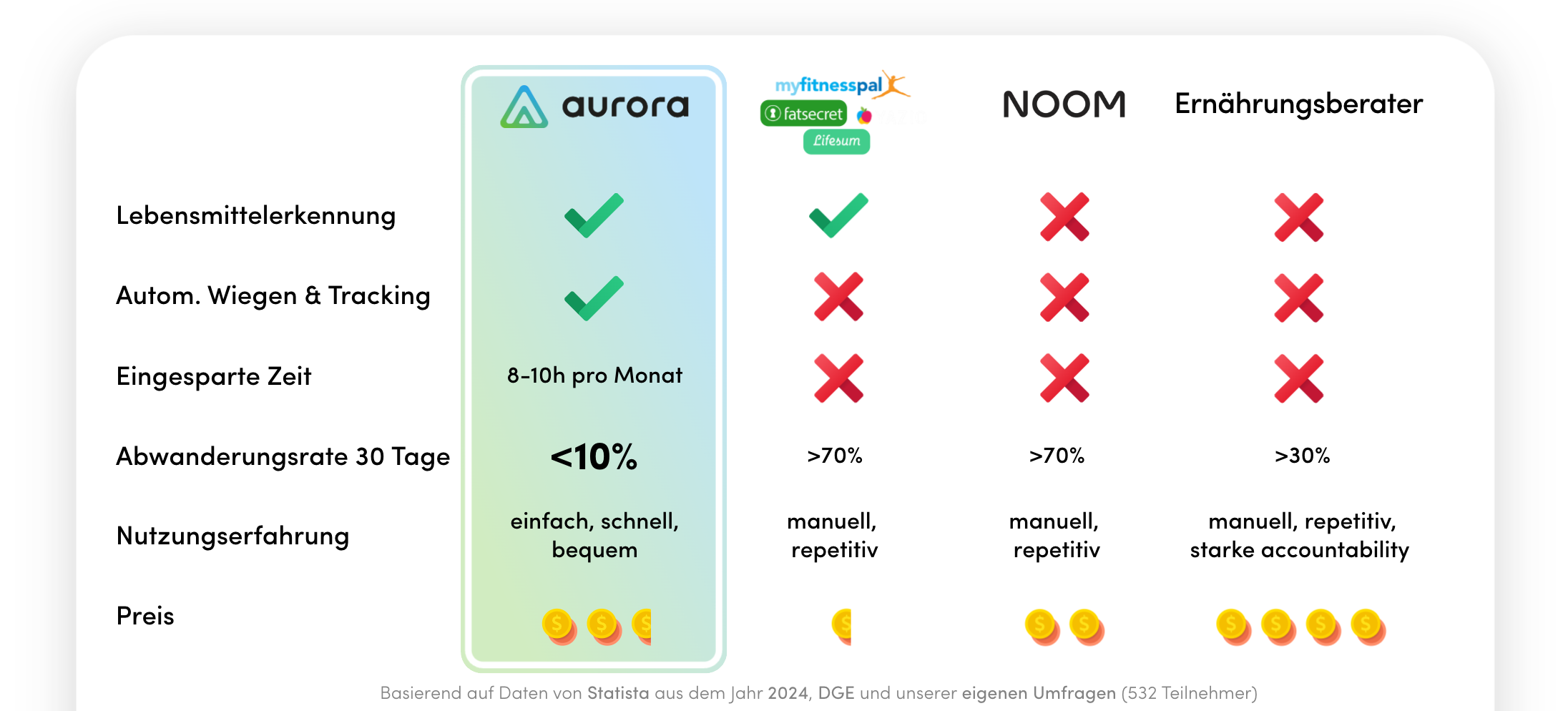 Aurora Life Science revolutioniert diesen Prozess und macht Ernährungstracking kinderleicht: egal ob zum Abnehmen, für Profisportler oder aus gesundheitlichen Gründen (z.B. Diabetes).  Kein Wunder, dass weniger als 10 % unserer Nutzer  innerhalb der ersten 30 Tage  der Nutzer aufgeben. Das heißt: Mehr als 90 % bleiben dran!