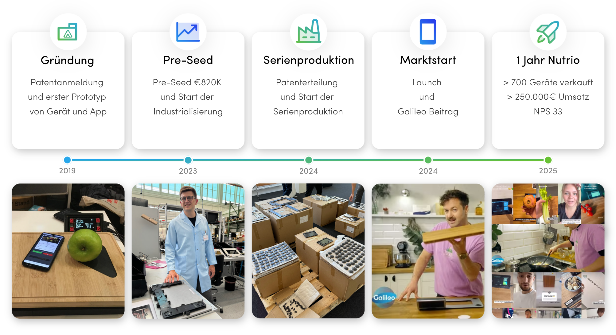 Zu unseren wichtigsten Meilensteinen gehören die Entwicklung des Nutrio-Prototyps (2019), der Abschluss der ersten Finanzierungsrunde (2023) und die darauf folgende Industrialisierung und schließene Aufnahme der Serienproduktion (2024), sowie den Erfolgreichen Launch (Q4 2024) mit Tausenden neuer App Nutzern, über 700 verkauften Geräten und mehr als 250.000 € Umsatz im ersten Jahr (2024/2025).  Langfristig streben wir an, führender Anbieter für digitales Ernährungstracking in Europa zu werden.
