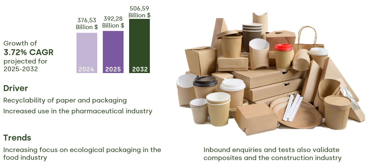 eco:fibr targets the global pulp and fiber raw material market, which has a volume of over €300 billion. The markets for specialty and packaging papers are particularly dynamic, driven by the trend of “paperisation” (replacing plastic with paper) and stricter regulations such as the EU regulation on deforestation-free supply chains.