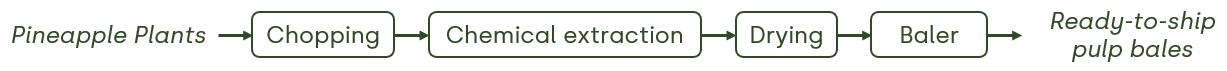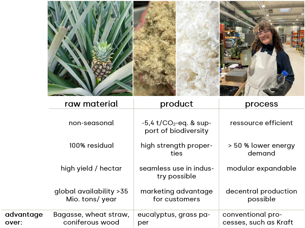 Pineapple cultivation not only creates an immense amount of residual material, but it also offers a higher yield per hectare per year compared to wood. Pineapple plants can be processed more resource-efficiently because they contain relatively little lignin, the molecule responsible for structural rigidity. The fibers extracted from these plants are also particularly well suited for use in industries such as paper production due to their fiber length and mechanical properties.