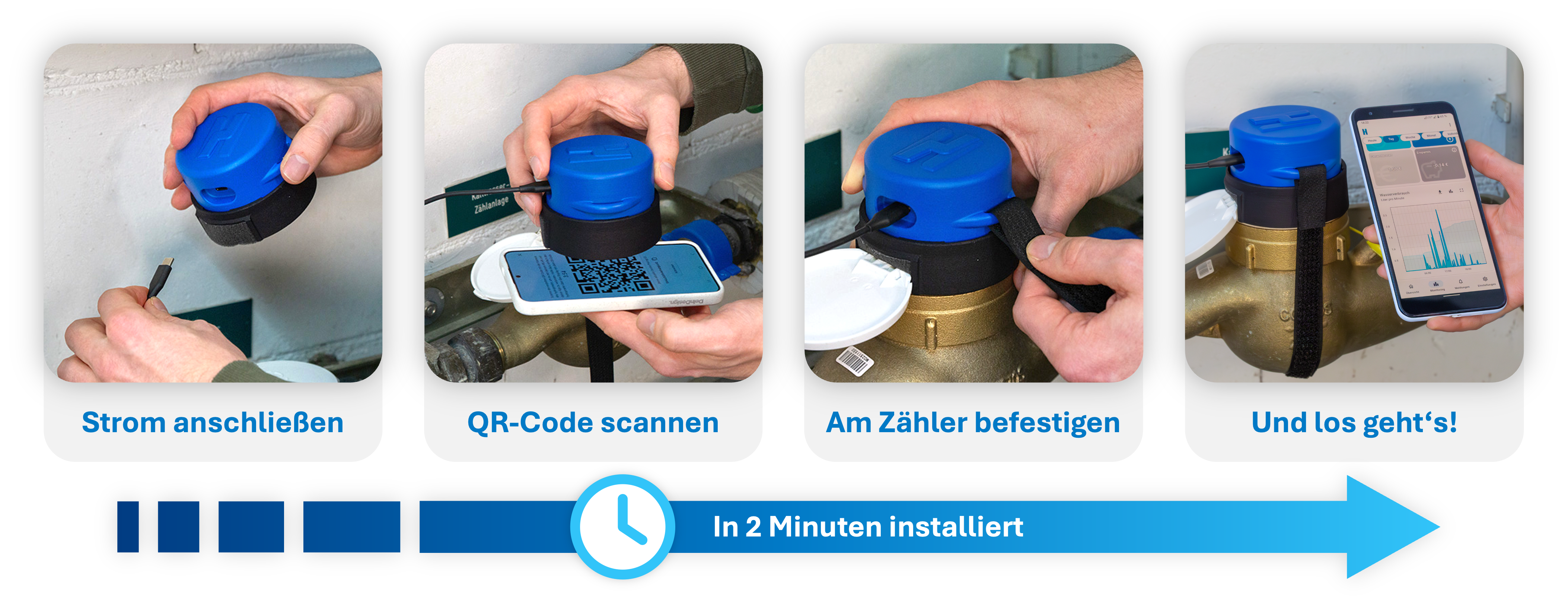 Das hydropmeter kann in nur zwei Minuten von jeder Person selbst installiert werden. Du musst lediglich das Gerät auf den Wasserzähler aufstecken, die Stromverbindung anschließen und das Gerät mit deinem WLAN verbinden.