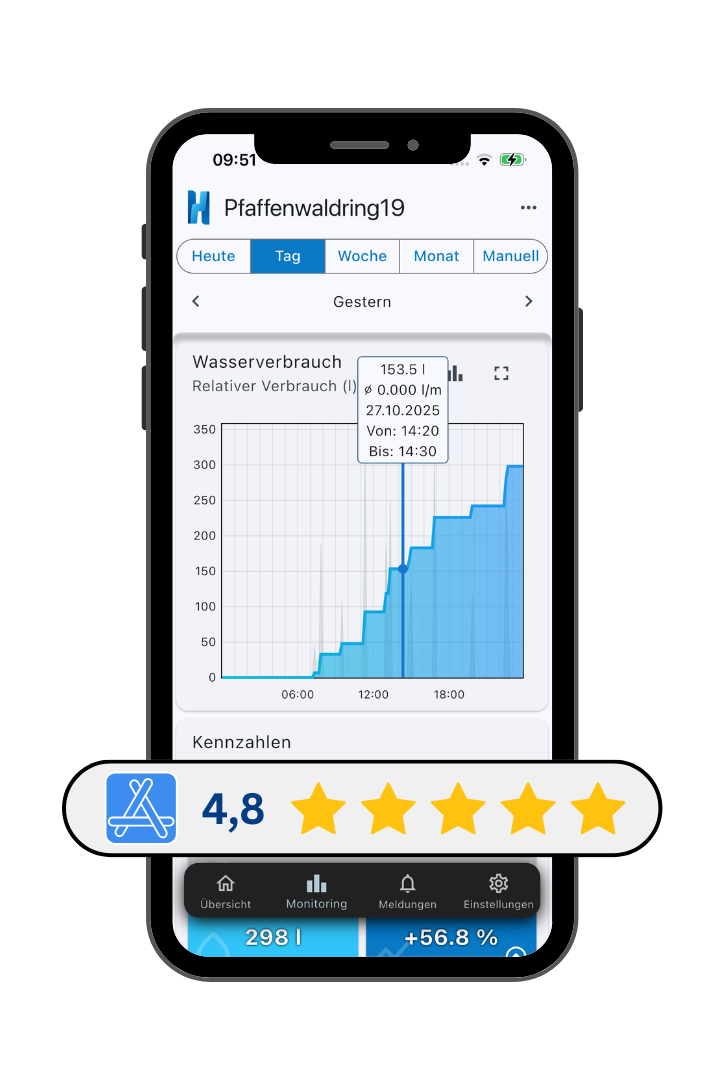 In der hydrop App (verfügbar für iOS und Android) wird der Echtzeit-Wasserverbrauch des Gebäudes übersichtlich dargestellt. Die Daten können ebenfalls in andere Anwendungen exportiert werden und eine Integration in bestehende Smart Home Applikationen (z.B. Home Assistant, ioBroker) und Gebäudeleitsysteme (z. B. Siemens Desigo) ist möglich. Im Frühjahr 2026 erfolgt der Launch der zusätzlichen hydrop Protect Funktion in der App. Diese löst bei einem erkannten Wasserschaden oder ungewöhnlichen Verbrauch einen Alarm per Push- Benachrichtigung aus. So können Schäden und unerwünschte Verbräuche auch direkt erkannt werden, wenn aktuell niemand vor Ort ist.