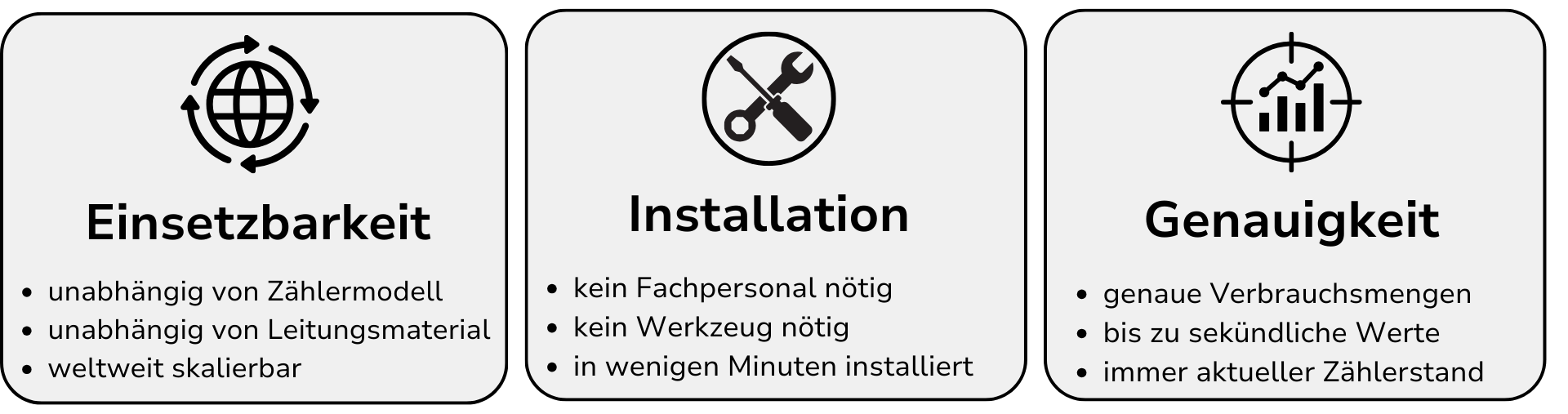 Im Gegensatz zu Marktbegleitern verfolgt hydrop systems mit der KI-basierten Erfassung von Verbrauchsdaten einen technisch überlegenen Ansatz. Dadurch wird die Installation spielend einfach und kann in nur zwei Minuten von jeder Person eigenständig durchgeführt werden. Gleichzeitig ist die Lösung unabhängig vom Leitungsrohr und muss lediglich auf den bereits vorhandenen Wasserzähler aufgesetzt werden, wodurch das hydropmeter deutlich günstiger ist als invasive Systeme. Im Gegensatz zu Ultraschall- und Wärmesensorik ist die Messung außerdem deutlich genauer und die Menge des Wasserflusses kann ermittelt werden.