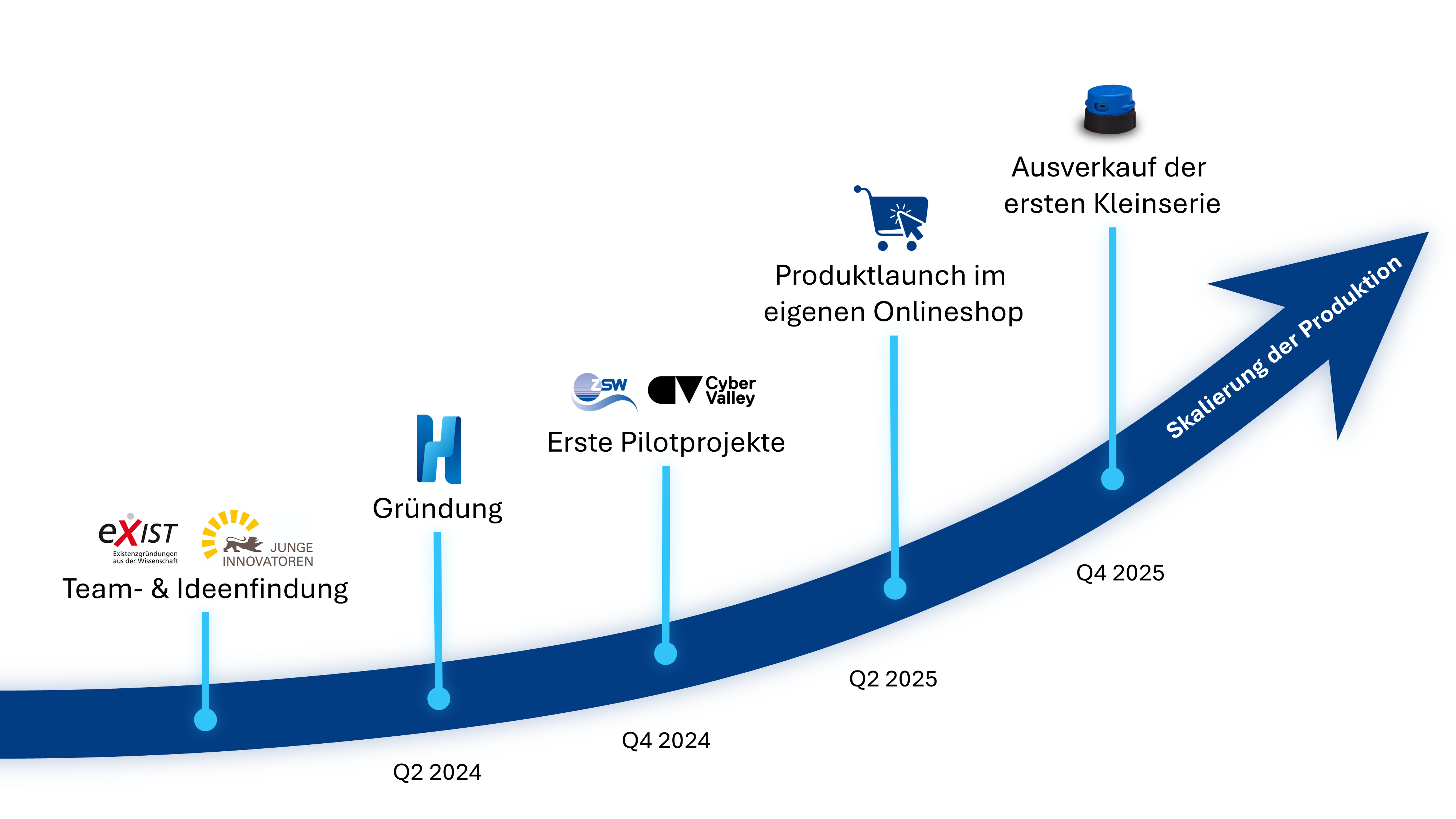Im Vorfeld der Unternehmensgründung wurde das Team vom EXIST-Gründungsstipendium sowie dem baden-württembergischen Programm Junge Innovatoren unterstützt und absolvierte mehrere Accelerator-Programme (u.a. bei NXTGN, AXEL, beVisioneers, Impact Hub). Nach der Gründung starteten schnell die ersten Pilotprojekte, bevor das hydropmeter 2025 auf den Markt kam. Die erste Kleinserie wurde bereits nach wenigen Monaten ausverkauft und der nächste Schritt ist die Skalierung der Produktentwicklung und des Vertriebs. Besonders stolz sind wir auf unsere Qualität Made in Germany: Das hydropmeter wird vollständig in Süddeutschland von unseren erfahrenen Partnern gefertigt.